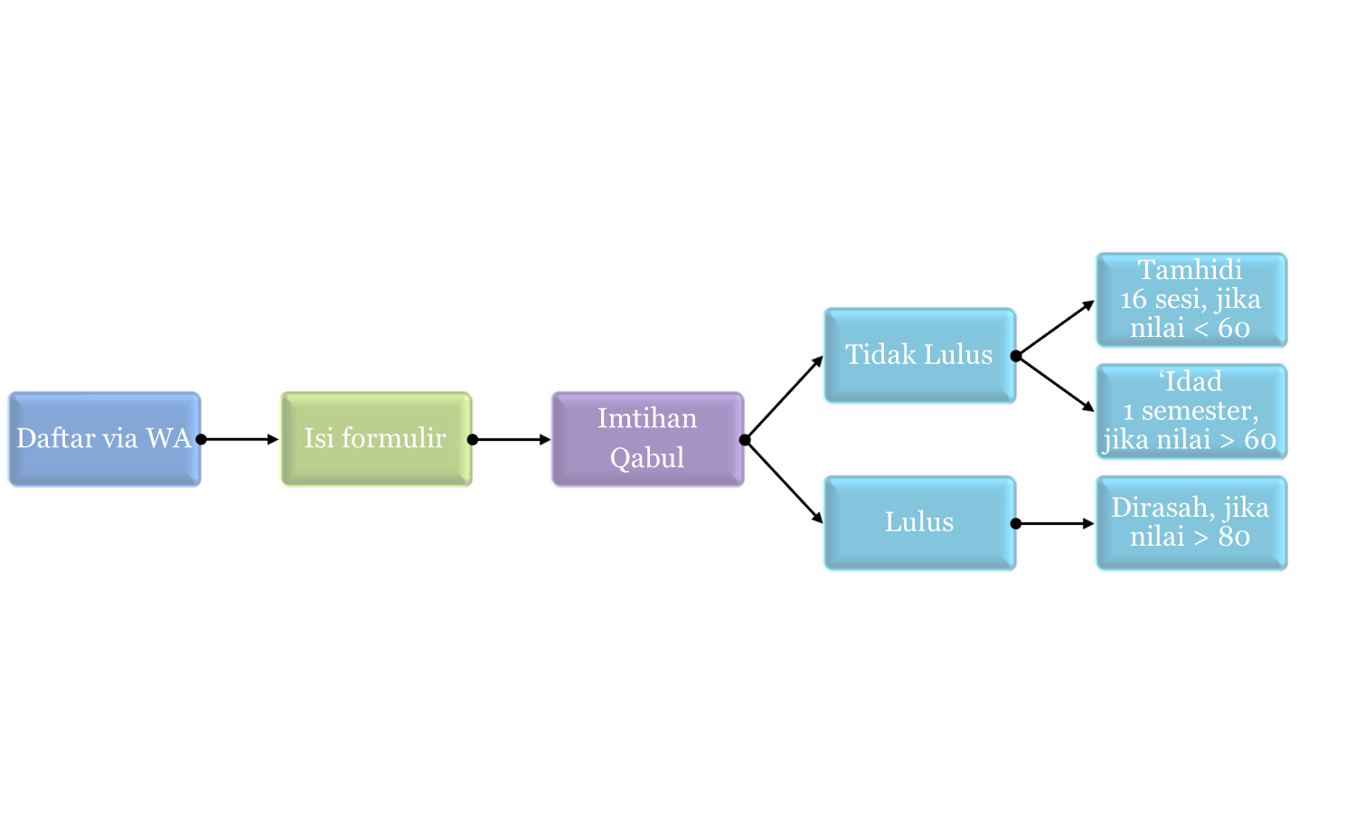 - Anda kemudian mengikuti tes seleksi secara online. Tes masuk ini akan menentukan diterima atau tidaknya di Program Dirasah Islam. Jika nilainya tidak memenuhi syarat masuk ke Dirasah, maka Anda akan otomatis masuk di kelas persiapan (‘idad) atau matrikulasi (tamhidi) sesuai besaran nilai yang diperoleh. Informasi hasil akan kami kabarkan melalui website dan media sosial.