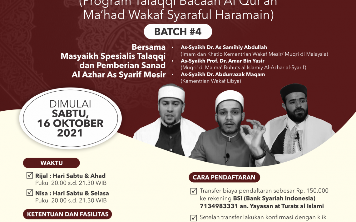 MAQRA’AH MSH adalah Program Talaqqi Bacaan Al Qur’an Ma’had Wakaf Syaraful Haramain bersama Masyaikh Al Azhar Cairo, Mesir. Belajar membaca Al Quran langsung dibimbing oleh Masyaikh Al Azhar. Disediakan penterjemah. Biaya: Rp. 150.000 untuk 8X pertemuan Pelaksanaan: Rijal setiap Sabtu dan Ahad pukul 20.00-21.30 wib […]