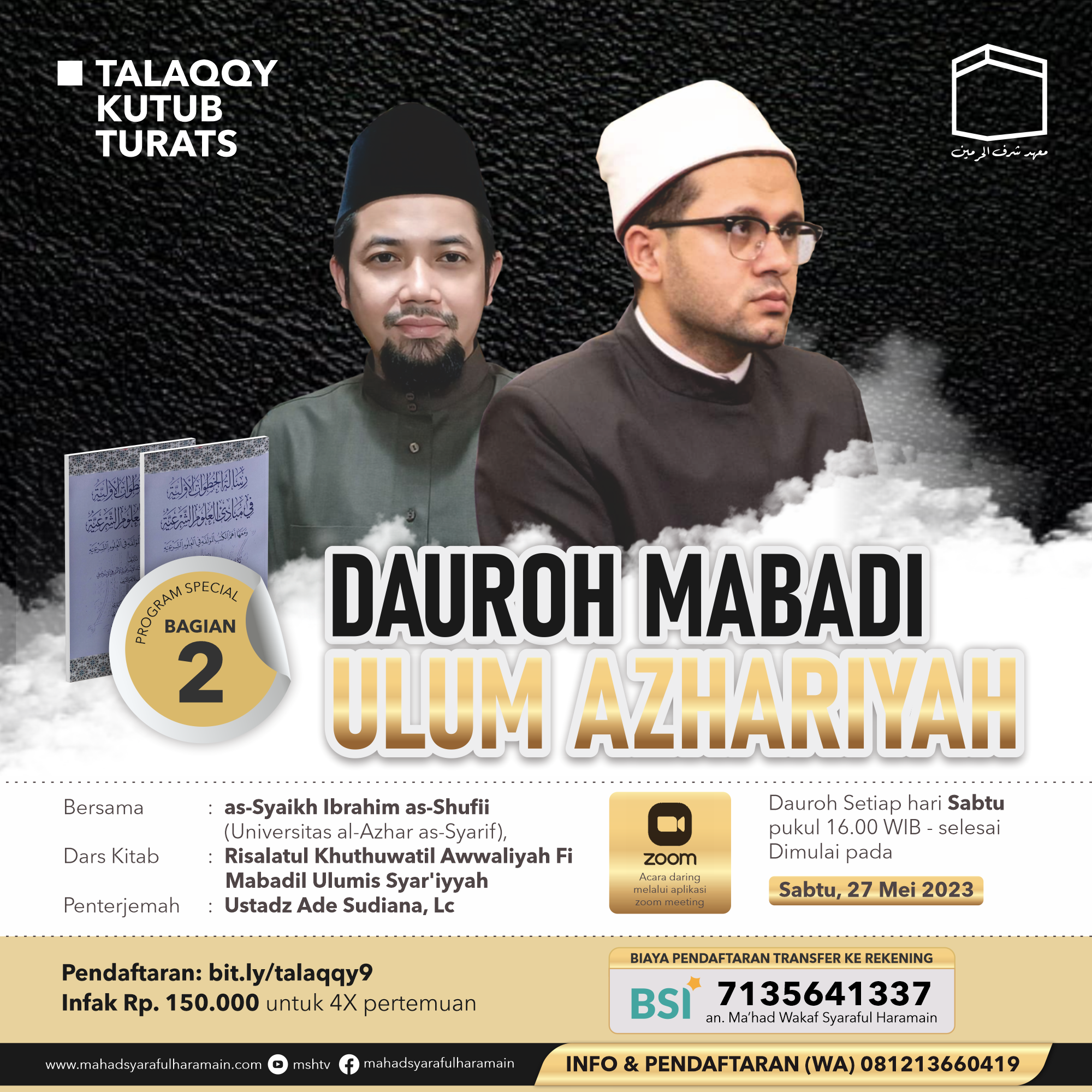 Ma’had Wakaf Syaraful Haramain bekerjasama dengan al-Muassasah al-‘Alamiyyah Li Taisîril Ulùûm Wa Nasyrihâ, kali ini akan mengkaji kitab “Risalatul Khuthuwatil Awwaliyah Fi Mabadi’il Ulumis Syar’iyyah karangan Syeikh Muhammad Alfin, yang mendapatkan taqrizhat dari para Masyayikh di Al-Azhar as-Syarif, kitab yang memberi gambaran mabadi dan kharithah ‘ulum syar’iyyah, disertai manhaj pembelajar di setiap level, baik dasar menengah dan lanjutan.