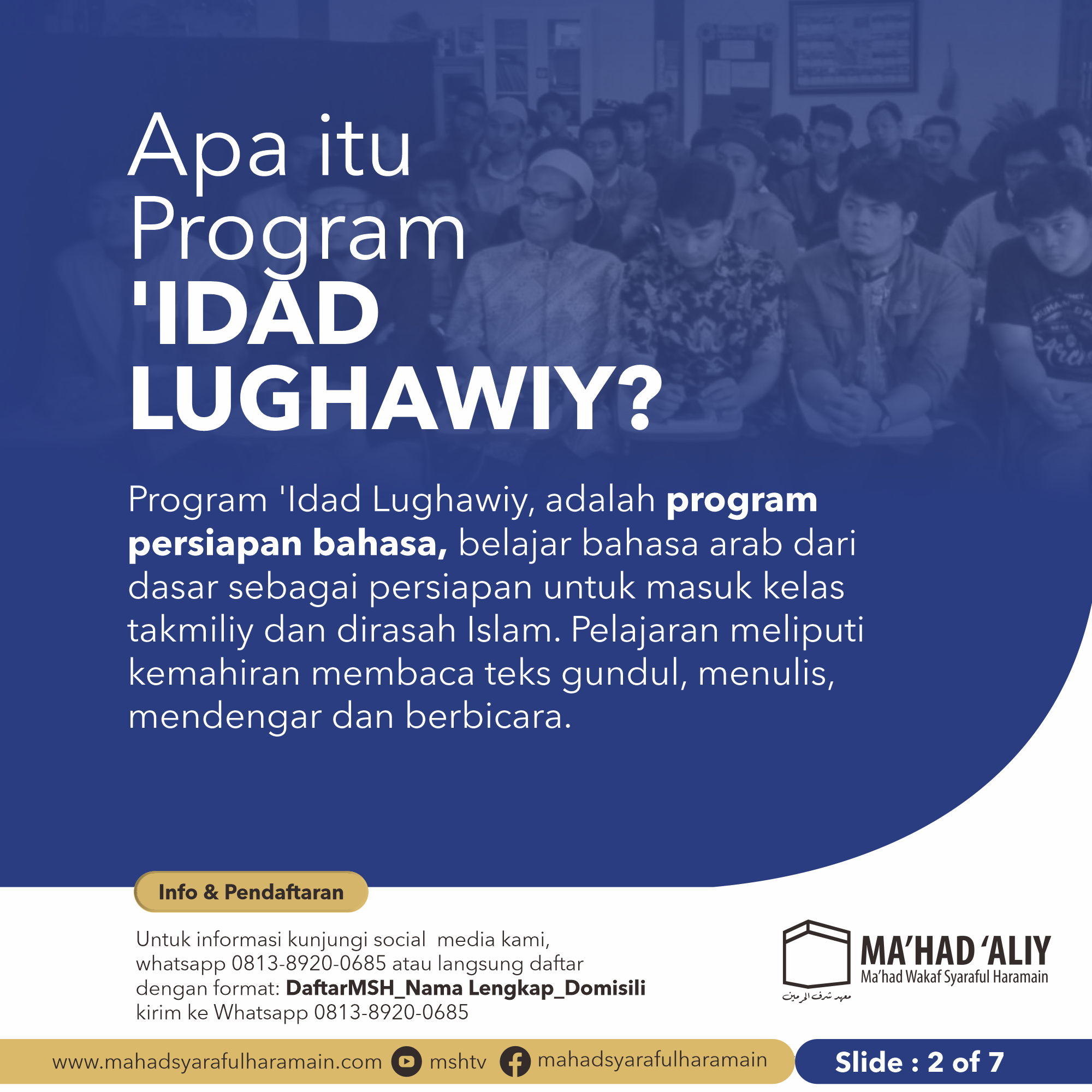 Ma’had ‘Aliy Ma’had Syaraful Haramain telah membuka Pendaftaran Mahasantri Baru (PMB) Program ‘idad Lughawiy tahun 1444 – 1445 H